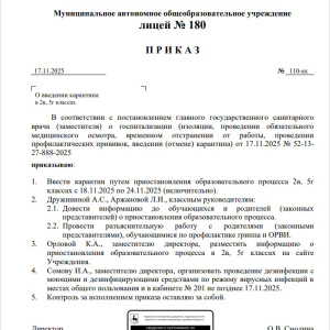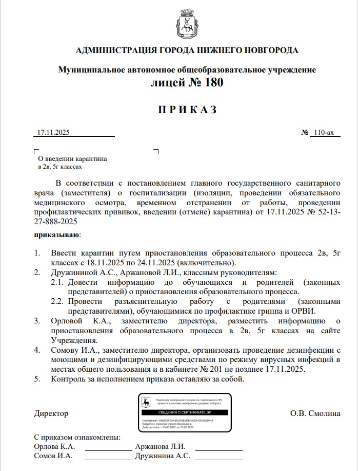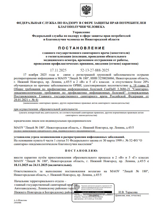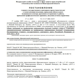 В соответствии с постановлением главного государственного санитарного врача (заместителя) о госпитализации (изоляции, проведении обязательного медицинского осмотра, временном отстранении от работы, проведении профилактических прививок, введении (отмене) карантина) от 17.11.2025 № 52-13- 27-888-2025 вводится карантин путем приостановления образовательного процесса 2в, 5г классах с 18.11.2025 по 24.11.2025 (включительно).